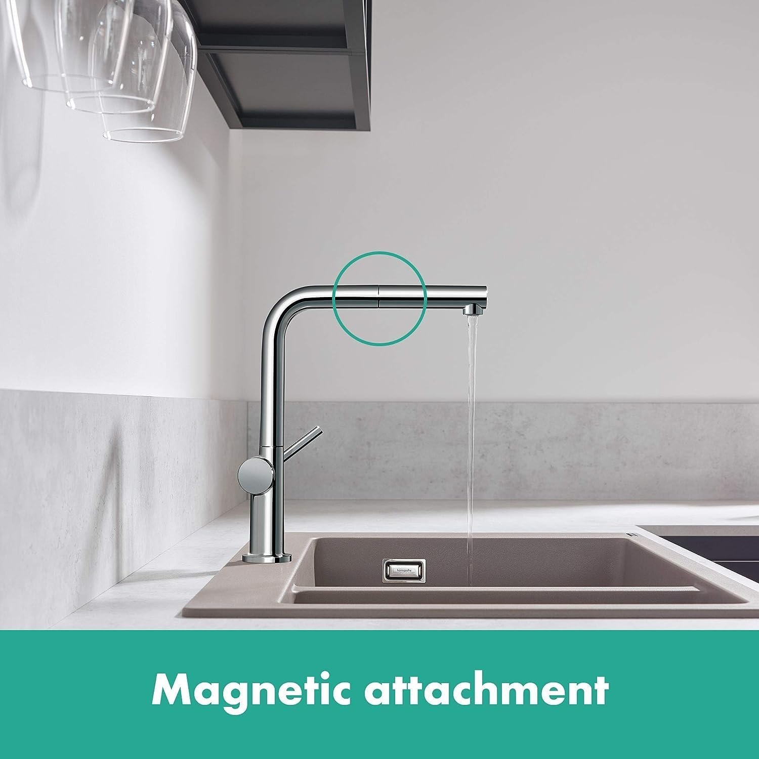 • Magnetische Halterung: Der Ausziehschlauch gleitet fast geräuschlos zurück in den Auslauf und wird dort von starken Magneten sicher fixiert. Mit einem satten „Klick“ rastet die Brause ein.