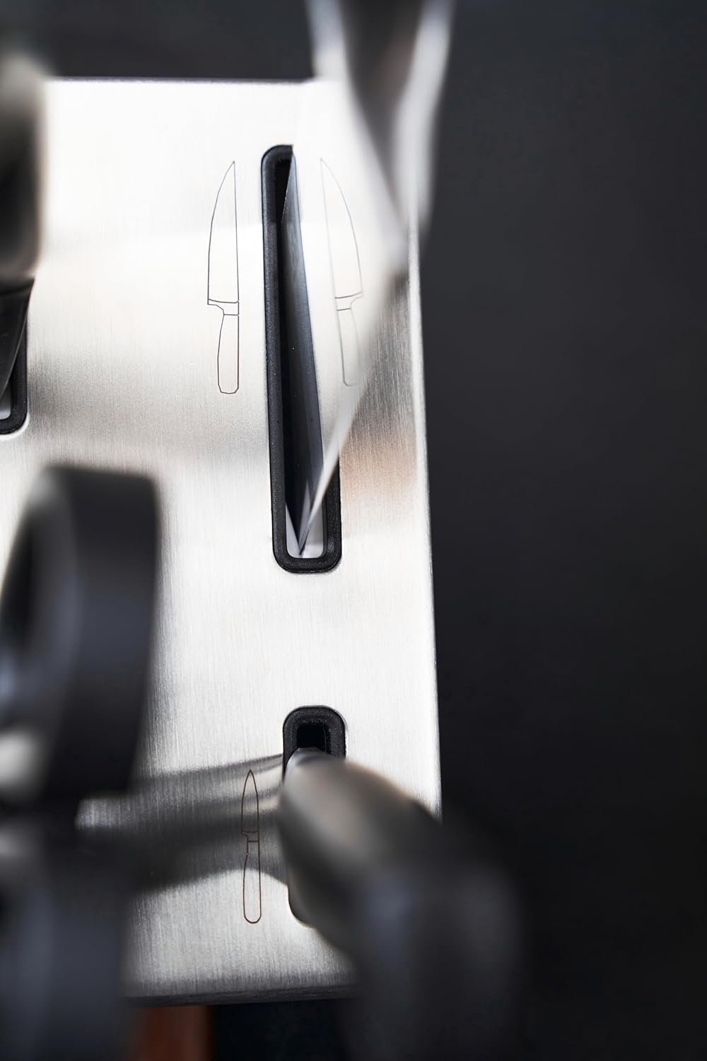 Der selbstschärfende Block: In modernem Grau, beschriftet mit Piktogrammen, damit jedes Messer in das richtige (schärfende) Fach kommt.